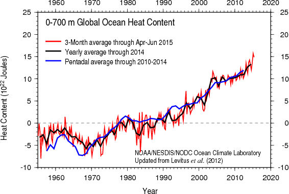 Converting the ocean heat content change back to temperature change reveals an interesting discrepancy between NOAA’s data and that of the ARGO system. Over the period of ARGO data, from 2004-2014, the NOAA data imply that the oceans are warming at 0.05 Cº decade–1, equivalent to 0.5 Cº century–1, or rather more than double the rate shown by ARGO.