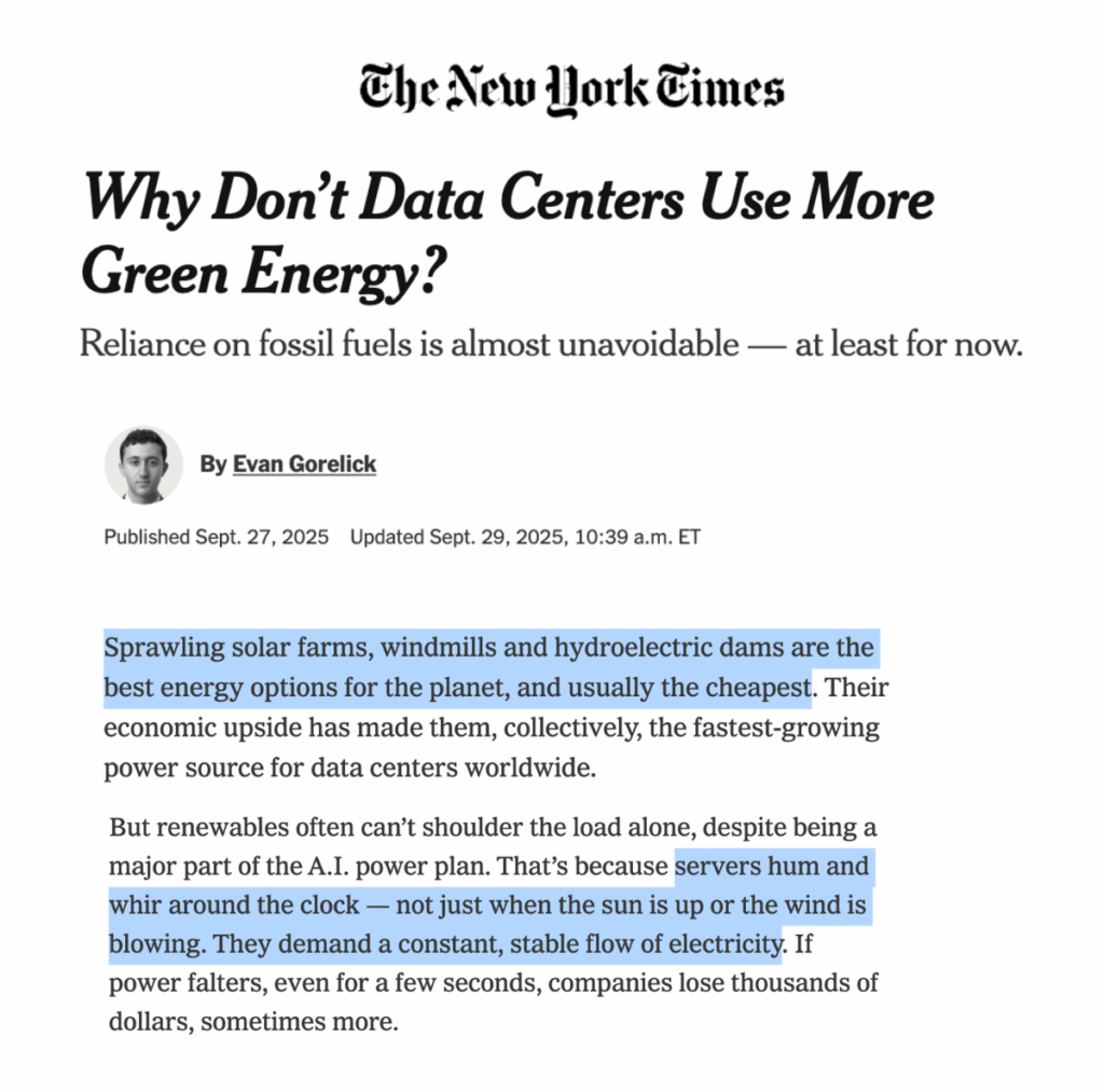 Even the @nytimes now acknowledges that unreliable solar and wind can't power data centers—but not without pretending that solar and wind are somehow cheaper than fossil fuels. But "cheap" solar and wind is obviously meaningless when it's not reliable enough to use! pic.twitter.com/HaWlA4UOcs — Alex Epstein (@AlexEpstein) October 1, 2025