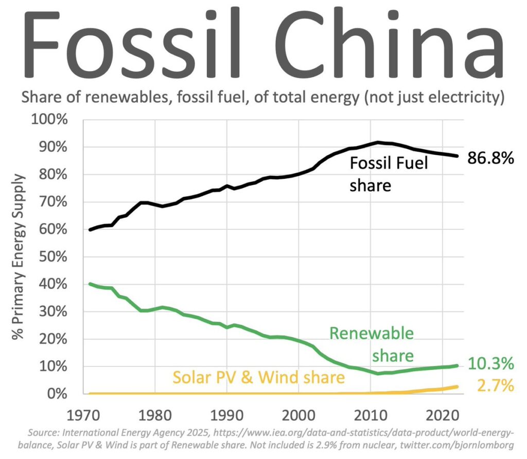 China is mostly fossil-fuel powered, and on current trends will reach 100% renewables by year 2431https://t.co/Va31r95xx6 Threads&refs:https://t.co/3HRRegZyjX pic.twitter.com/M4I8Ui1jew — Bjorn Lomborg (@BjornLomborg) October 3, 2025 Green hype vs reality Bloomberg: China push the energy transition and 'many looking to China to lead the fight against global warming' Reality: China's renewable fraction (biomass, hydro, solar, wind […]