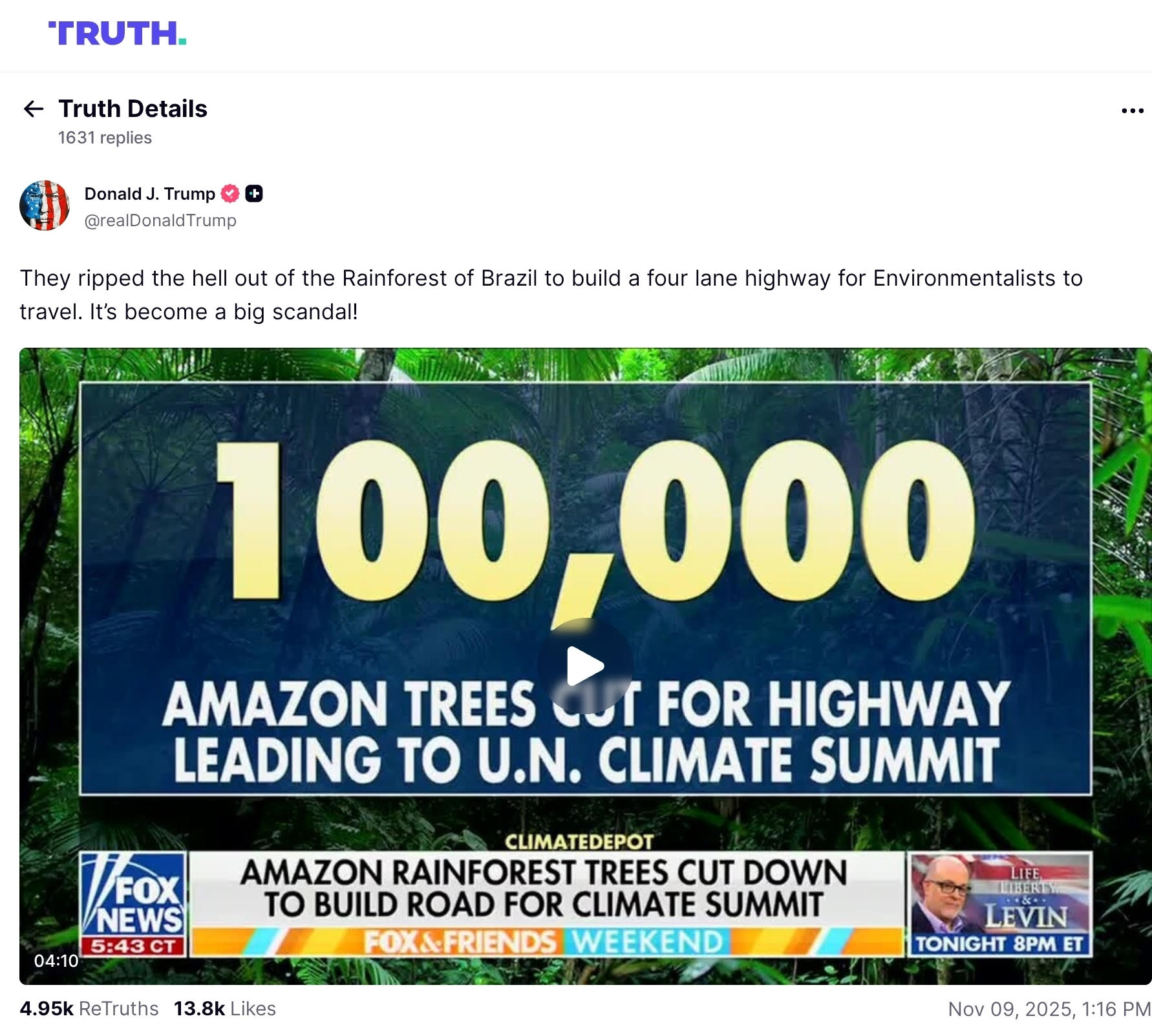 Trump posts on Truth Social with an embedded video of Morano’s Fox & Friends segment live from Brazil at COP30 about cutting down Amazon rainforest for 4-lane highway – AKA Clear-Cut30 November 9, 2025