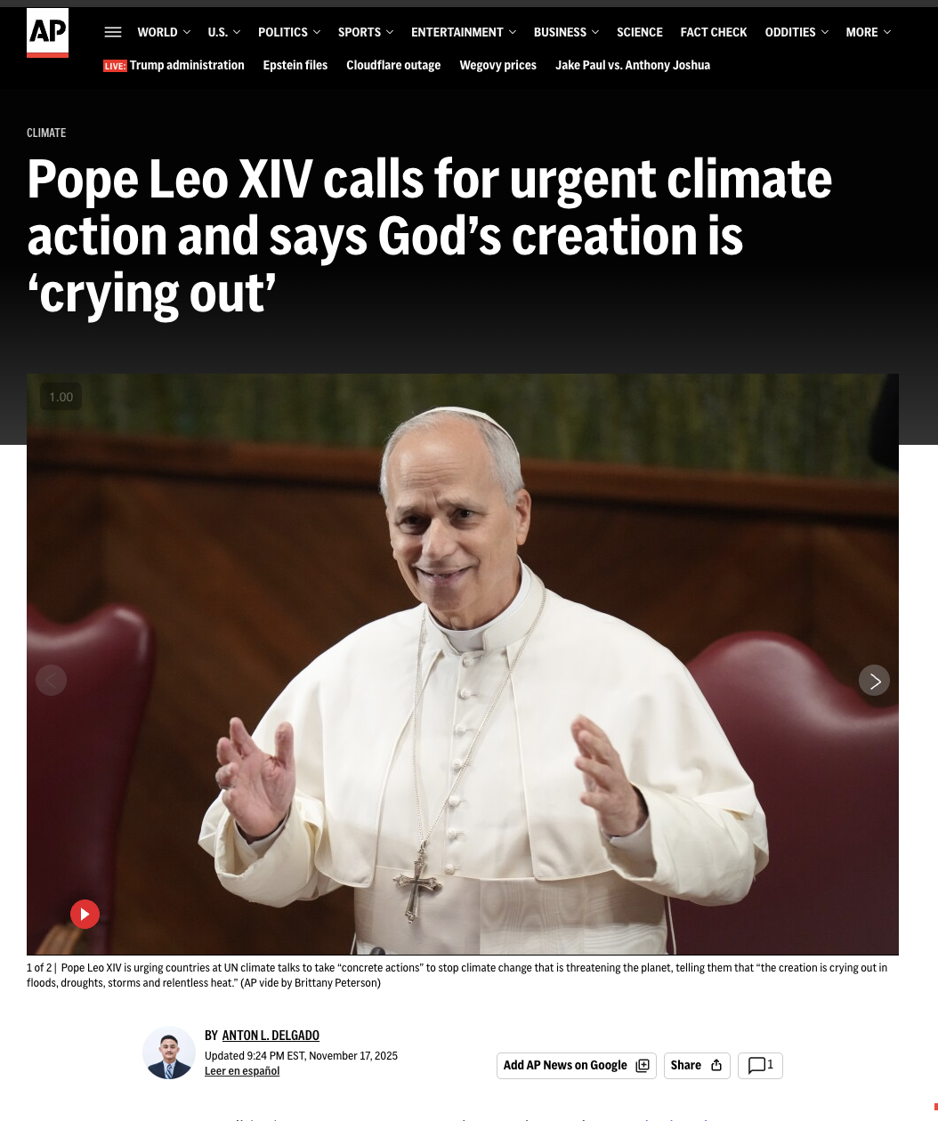 Pope Leo XIV urges ‘concrete actions’ to stop climate change & says God’s creation is ‘crying out’ November 18, 2025