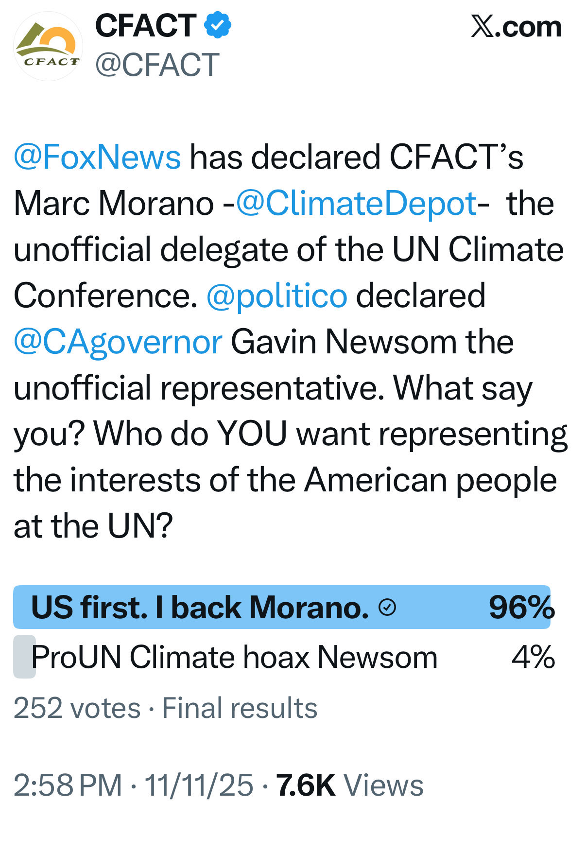 Morano wins with dictator-like margins! The results are in! The online public votes Morano 96% to Gov. Newsom’s 4% to be ‘unofficial’ climate delegate to UN climate summit! November 13, 2025