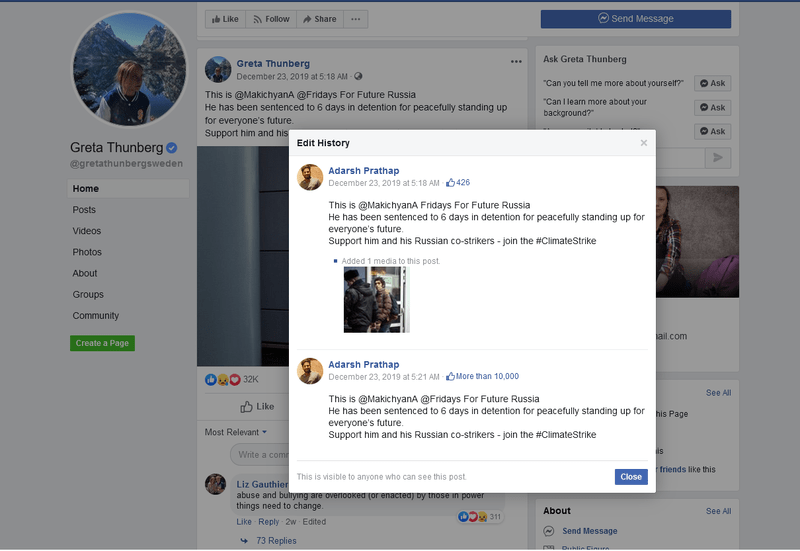 “The rest that is shared on Facebook is reposted from Twitter and Instagram by the guy who founded the Greta Thunberg Facebook page long before I knew it existed. His name is Adarsh Prathap and he lives in India. Since a lot of people thought it was my official page in the beginning I asked if I could co-manage it and he said yes.“