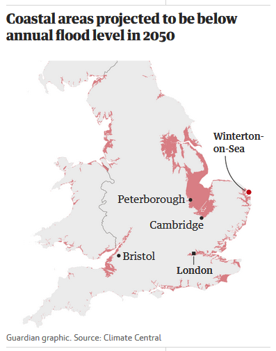 Two years ago, the US-based climate change research group Climate Central went further. It produced a map showing areas of the UK at risk of being underwater by 2050. They included sections of north Norfolk, all of the Lincolnshire coast and much of Cambridgeshire, along with parts of East Yorkshire, Merseyside and the Bristol area. According to the group, this would happen even if “moderate” attempts were made to combat climate change.