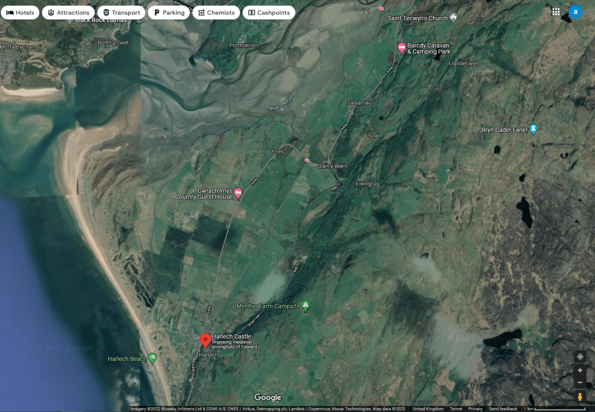 Over the centuries since then, the sea has gradually retreated as the land rose, leaving the castle now a mile from the shore, as you can see in the screenshot from Google Maps below: