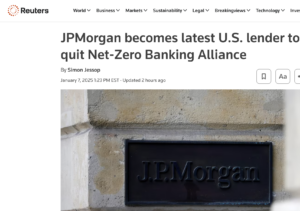 https://www.reuters.com/business/environment/jpmorgan-says-leave-net-zero-banking-alliance-2025-01-07/ By Simon Jessop Last of the Big-6 U.S. banks to leave the group Says remains ‘focused on pragmatic’ climate solutions Exit comes amid rising U.S. political pressure LONDON, Jan 7 (Reuters) – JPMorgan (JPM.N), opens new tab said on Tuesday it was leaving the Net-Zero Banking Alliance, the latest U.S. lender to quit the sector’s biggest climate … Continue reading And Then There Were NONE! JPMorgan becomes last of the Big-6 U.S. banks to quit Net-Zero Banking Alliance