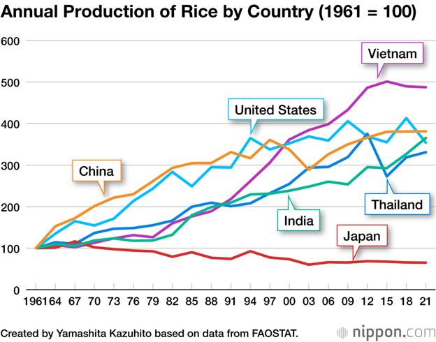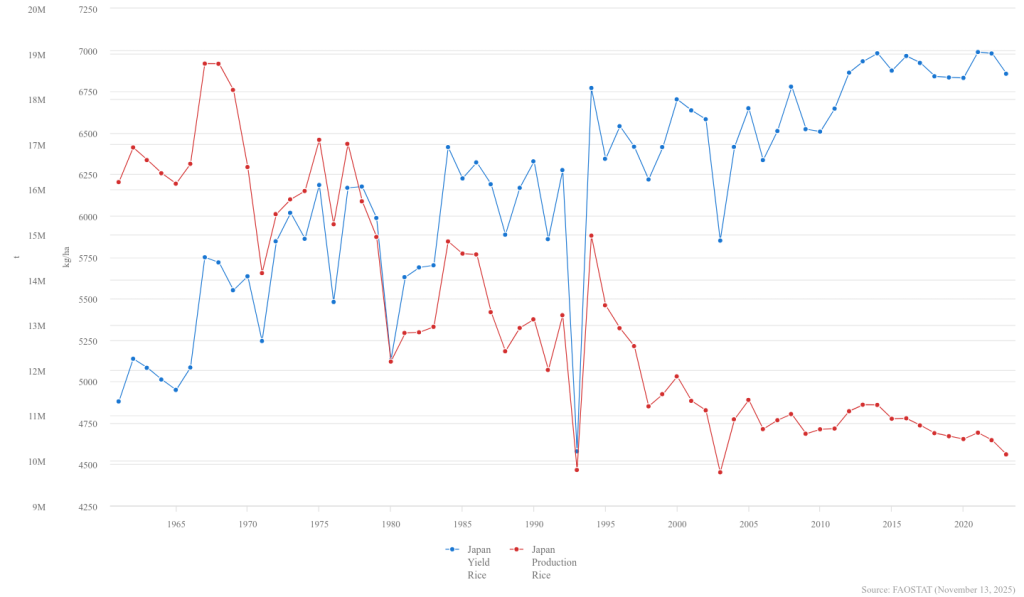 This information is easily found, even if you are not familiar with Japanese agricultural policy. The fact that the FAO data clearly show yields increasing even as production has declined should have sent up alarm bells for the author of the El País article.