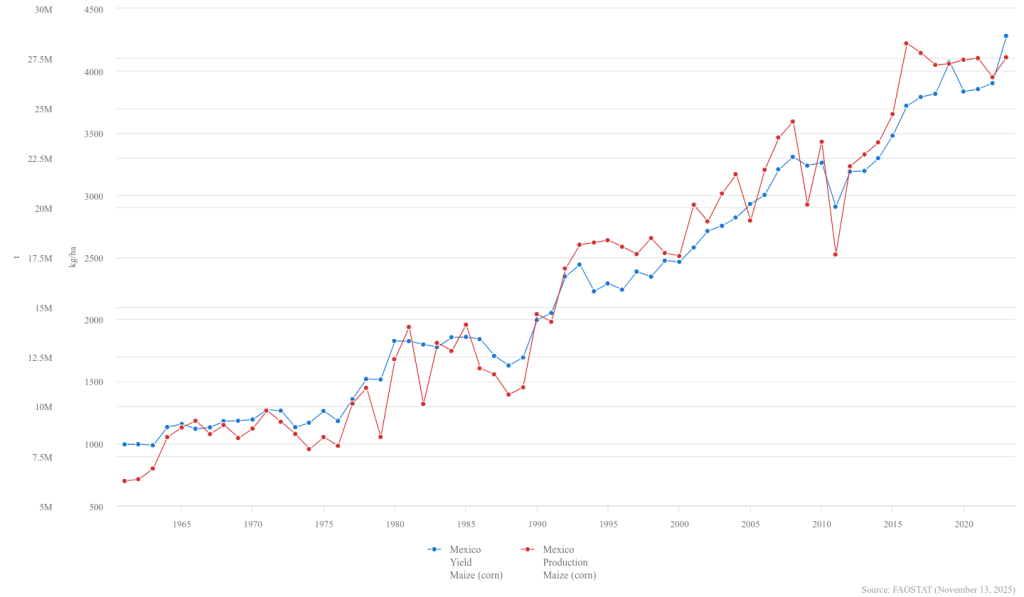 In Mexico, El País says that “white corn” production has dwindled and is “no longer sufficient to meet domestic demand.” But FAO data show that general corn production has increased 341 percent in Mexico since 1961, with a record breaking year as recently as 2016. (See figure below)