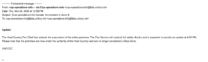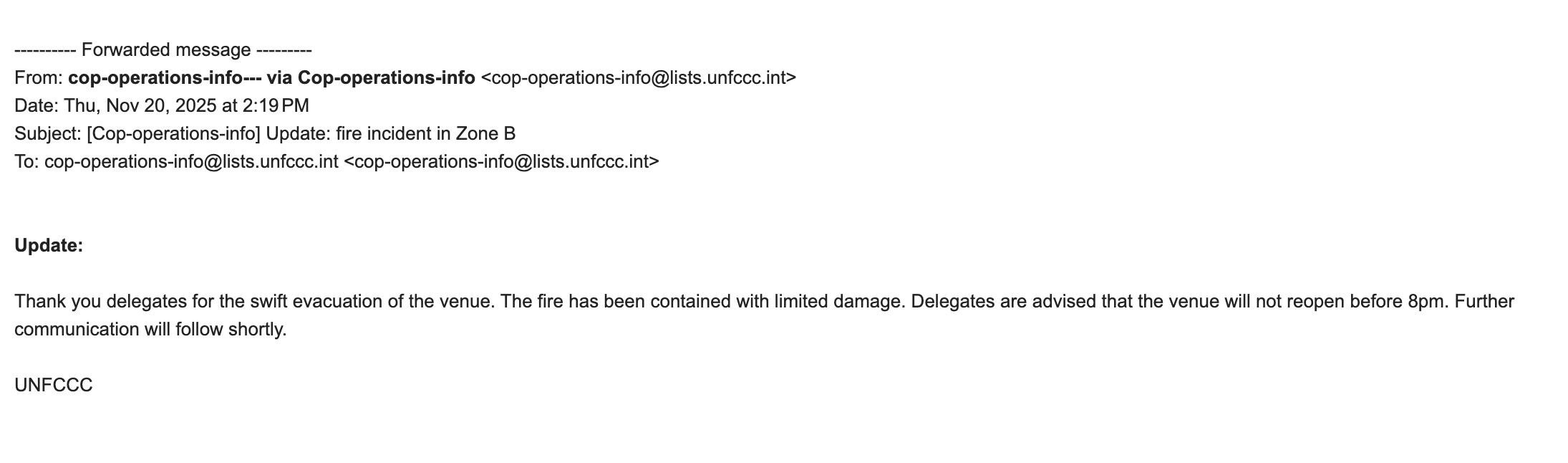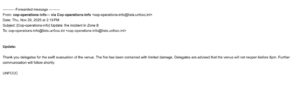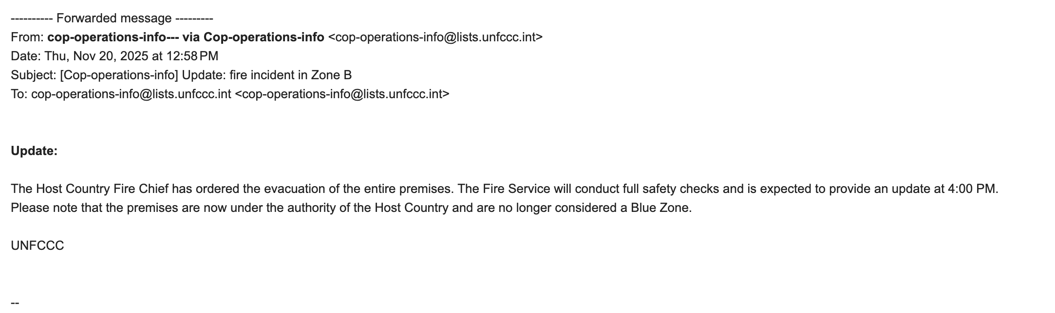 The Host Country Fire Chief has ordered the evacuation of the entire premises. The Fire Service will conduct full safety checks and is expected to provide an update at 4:00 PM.