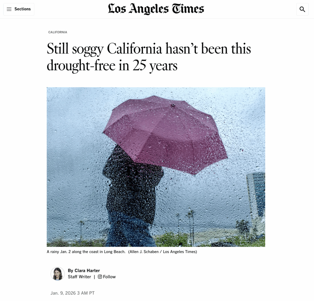 https://www.latimes.com/california/story/2026-01-09/california-has-no-areas-of-dryness-first-time-in-25-years By Clara Harter – La Times Staff Writer Excerpt: California has zero areas of abnormal dryness for the first time in 25 years after an exceptionally wet holiday season soaked the state. Currently, 14 of the state’s 17 major water reservoirs are at 70% capacity or higher and wildfire risk is minimal. Despite the […]