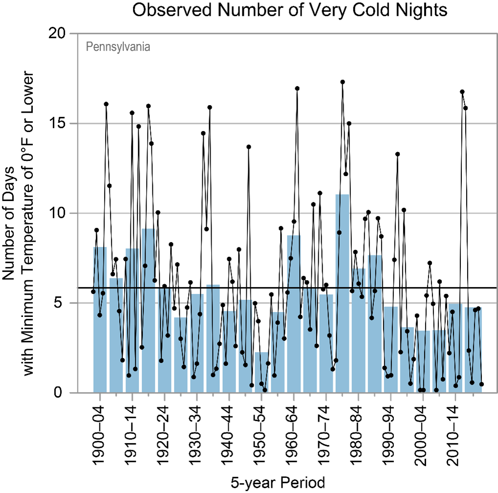 Additionally, data from the National Oceanic and Atmospheric Administration’s (NOAA) state climate summaries show that heat spikes are not getting more common. Rather, the long-term slight rise in temperatures is due to days and nights with extremely low temperatures becoming less common, and nighttime temperatures (which are particularly influenced by UHI) are modestly warmer than they were a few decades ago.