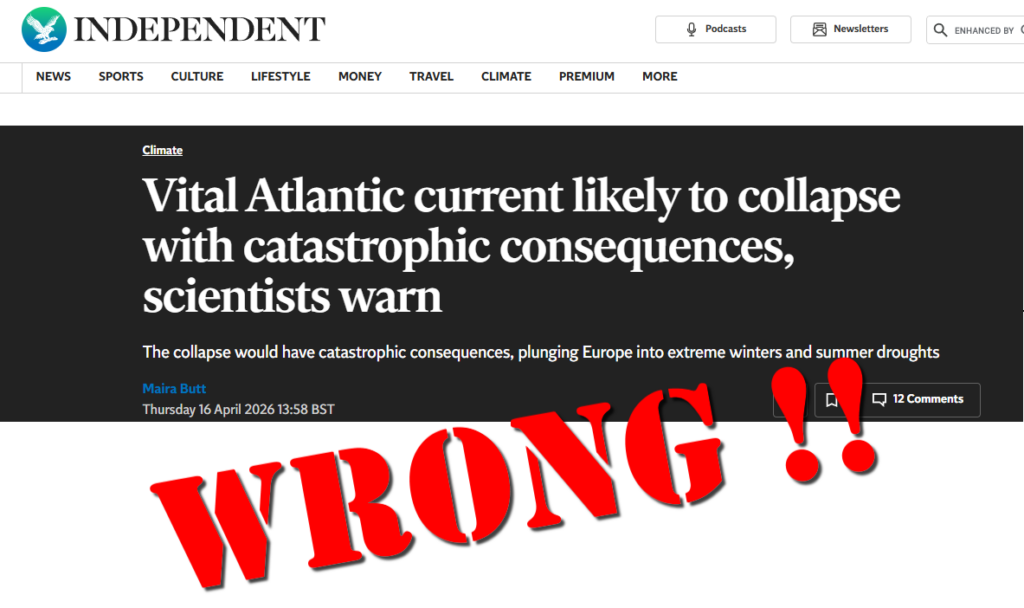 Wrong, The Independent, the Atlantic Current Isn’t on the Brink of Collapse By Anthony Watts The Independent claims in “Vital Atlantic current likely to collapse with catastrophic consequences, scientists warn” that the Atlantic Meridional Overturning Circulation (AMOC) is significantly more likely to shut down within decades, plunging Europe into extreme winters and triggering global disruption. This is wrong-headed speculation. […]