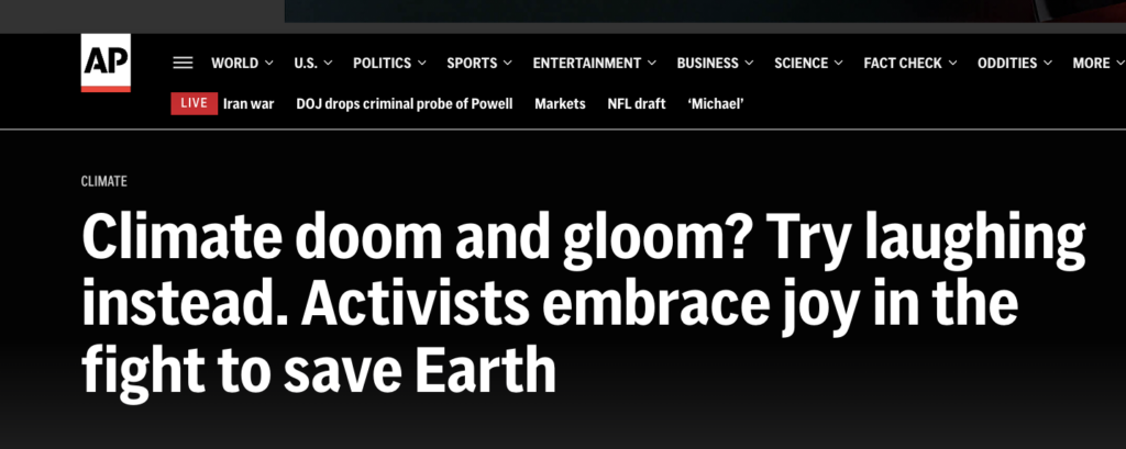 Borenstein’s April 22 Earth Day headline read like a heaping pile of satire: “Climate doom and gloom? Try laughing instead. Activists embrace joy in the fight to save Earth.”