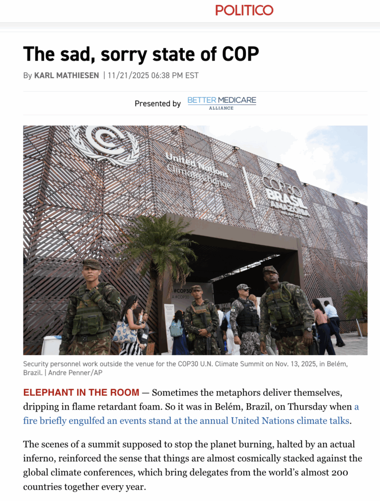 https://www.politico.com/newsletters/politico-nightly “A summit supposed to stop the planet burning, halted by an actual inferno, reinforced the sense that things are almost cosmically stacked against the global climate conferences…” By KARL MATHIESEN Excerpt: ELEPHANT IN THE ROOM — Sometimes the metaphors deliver themselves, dripping in flame retardant foam. So it was in Belém, Brazil, on Thursday […]