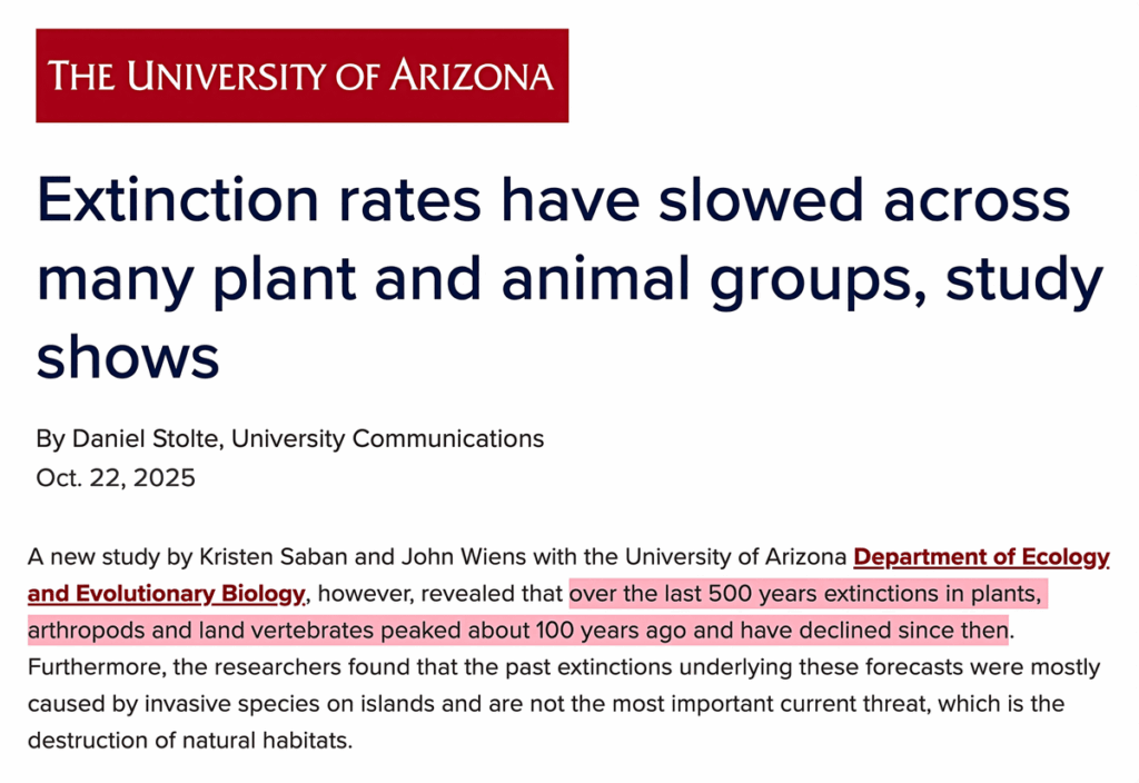 You’ve heard it a million times: species are going extinct at an unprecedented rate thanks to fossil fueled climate change. And yet this is totally false. New research from the University of Arizona shows that extinction rates have actually *slowed* over the last 100 years! pic.twitter.com/DNhS2H6NrJ — Alex Epstein (@AlexEpstein) November 30, 2025 Extinction […]