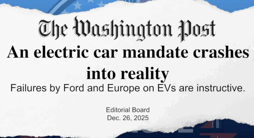 WaPo Editorial Board pans Biden’s failed EV mandate The WaPo editorial board notes that “red tape and union giveaways” killed Biden’s EV dreams, along with weak demand. At the same time, US car companies are struggling after going all in on Biden’s plans. pic.twitter.com/mET0qRUxhh — 10 Minute Drill (@10minutedrill) December 30, 2025 https://www.washingtonpost.com/opinions/2025/12/26/europe-eu-electric-vehicle-mandate/ WAPO: Editorial […]