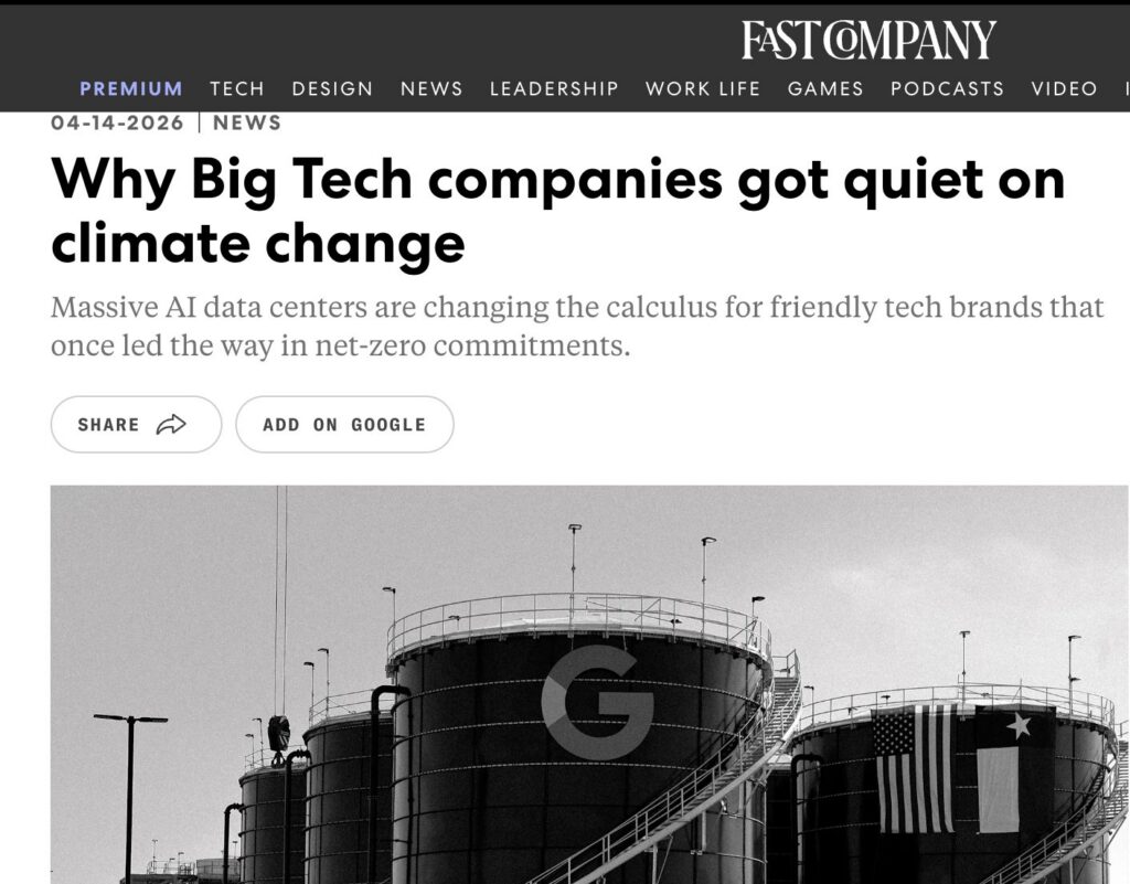 https://www.fastcompany.com/91525419/big-tech-talks-climate-change-less-ai-data-centers BY KRISTIN TOUSSAINT Google’s sustainability webpage once specifically mentioned the company’s goal to reach net-zero emissions by 2030, and included a subpage titled “operating sustainably.” But that pledge has disappeared from the main page, which now highlights the company’s commitment to artificial intelligence. The subpage was renamed “our operations.” Google maintains that it is still aiming for a 2030 goal, […]