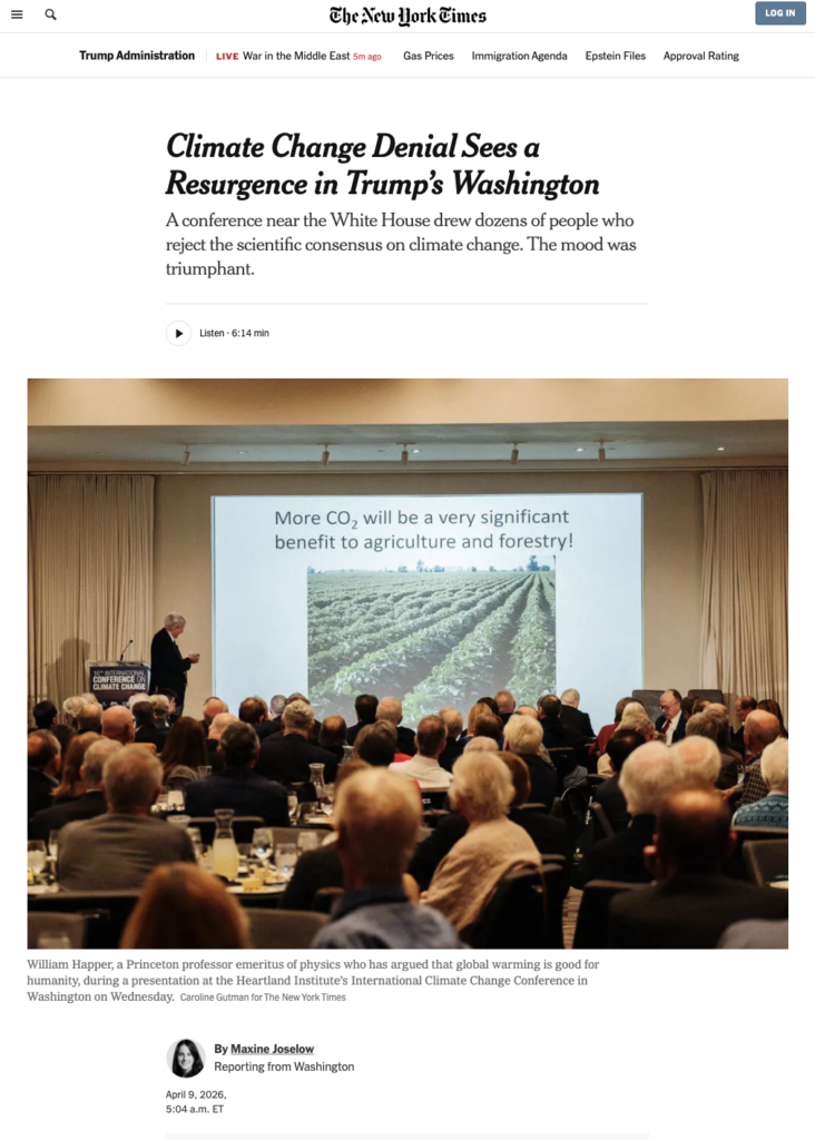 https://www.nytimes.com/2026/04/09/climate/climate-change-deniers-trump.html By Maxine Joselow – Reporting from Washington Excerpt: Climate change is a hoax perpetrated by “leftist politicians.” Fossil fuels are the greenest energy sources. More carbon dioxide in the atmosphere will be harmless. These were some of the false claims made at a conference on Wednesday held by groups that reject the overwhelming scientific […]