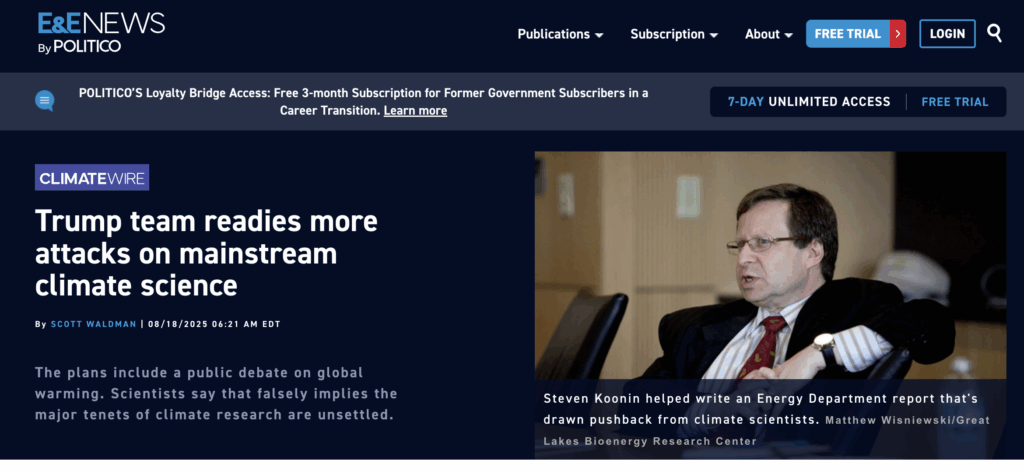 https://www.eenews.net/articles/trump-team-readies-more-attacks-on-mainstream-climate-science By SCOTT WALDMAN Excerpt: One author of a recent Department of Energy report that assailed established climate science said the 141-page document is only the beginning — and that the Trump administration plans to do more to undercut research that shows humanity’s use of fossil fuels is warming the planet and endangering its inhabitants. […]