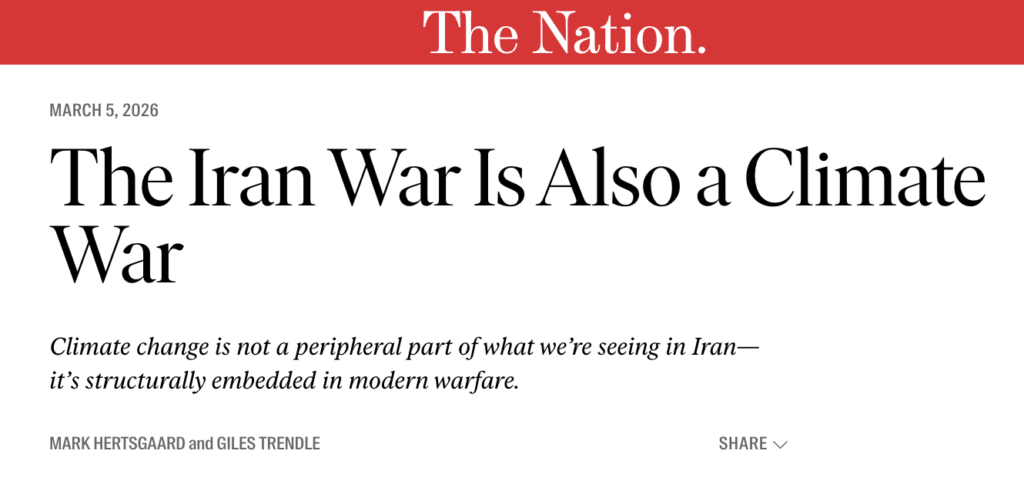 https://www.thenation.com/article/environment/iran-war-climate-change/ By Shae Cornette Excerpt: War makes climate change worse in many ways, and vice versa. The human costs of the US-Israel attack on Iran—the hundreds of people who have died, including a reported 175 young girls and teachers killed at the Shajareh Tayyibeh primary school—are a tragedy. The mounting economic risks—disrupted supply chains, rising […]