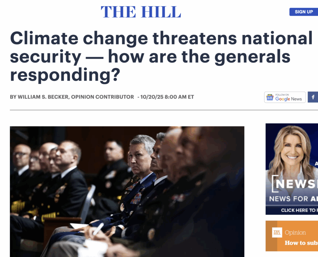 https://www.newsbusters.org/blogs/business/joseph-vazquez/2025/10/23/crazy-hill-op-ed-demands-generals-respond-climate-change By Joseph Vazquez Let’s hear a loud, soldier’s “HOOAH” for the fight against Mother Nature! At least, that’s what a nutty op-ed from The Hill is suggesting for top brass at the United States military. William Becker — executive director for the eco-extremist Presidential Climate Action Project, obviously unaffiliated with the White House — went on […]